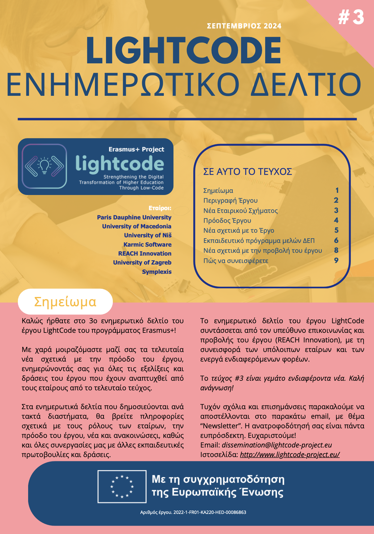Το τρίτο ενημερωτικό δελτίο του έργου Lightcode – Strengthening the digital transformation of higher education through low-code που δημοσιεύτηκε, παρουσιάζει όλα τα τελευταία νέα σχετικά με την πρόοδο του έργου, καθώς και όλες τις εργασίες και δραστηριότητες που αναπτύχθηκαν κατά το τελευταίο διάστημα από τους εταίρους του προγράμματος.