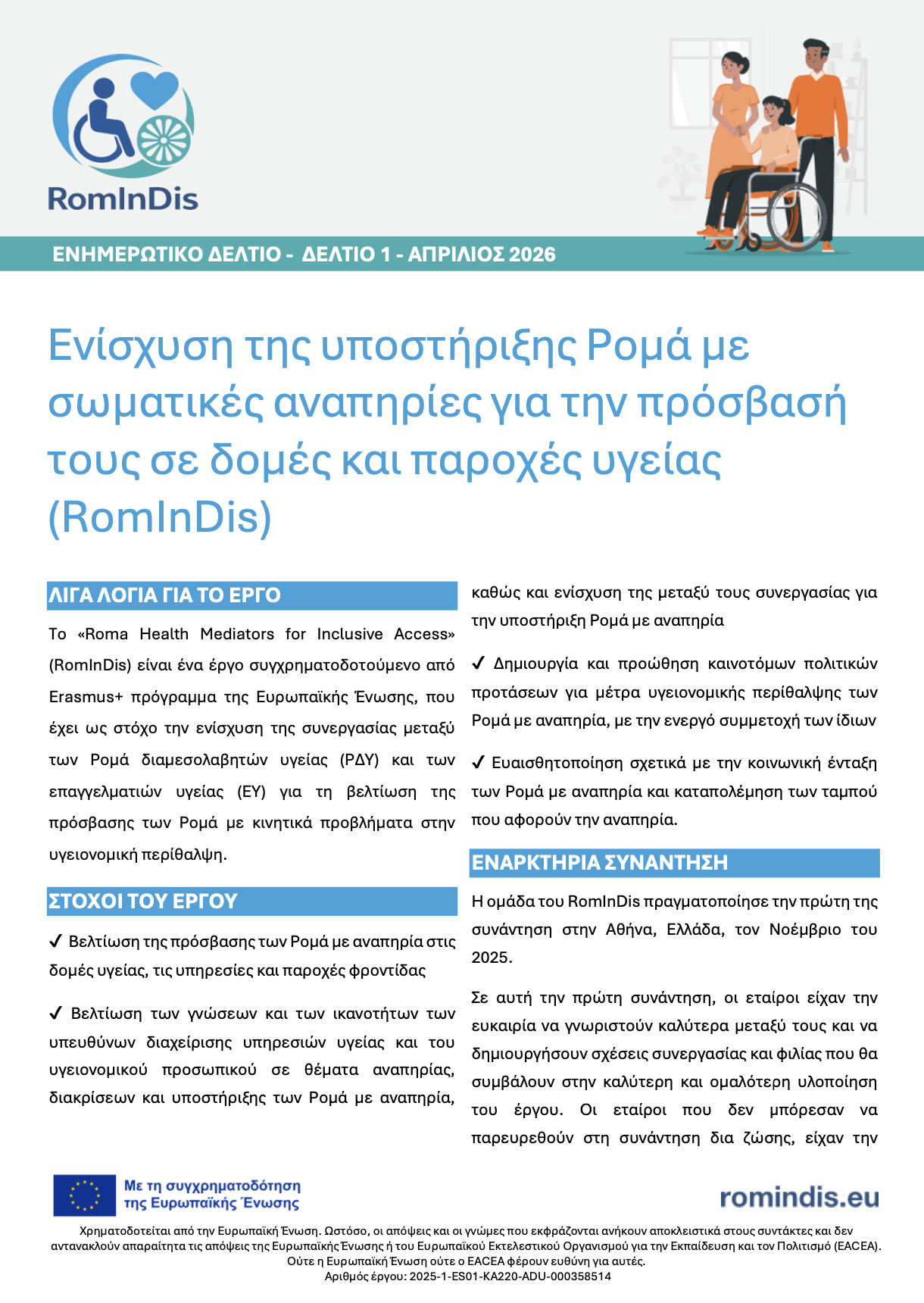 Το πρώτο ενημερωτικό δελτίο του έργου RomInDis – Ενίσχυση της υποστήριξης Ρομά με σωματικές αναπηρίες για την πρόσβασή τους σε δομές και παροχές υγείας κυκλοφόρησε και στα Ελληνικά!  Είναι ένα έργο συγχρηματοδοτούμενο από Erasmus+ πρόγραμμα της Ευρωπαϊκής Ένωσης, που έχει ως στόχο την ενίσχυση της συνεργασίας μεταξύ των Ρομά διαμεσολαβητών υγείας (ΡΔΥ) και των επαγγελματιών υγείας (ΕΥ) για τη βελτίωση της πρόσβασης των Ρομά με κινητικά προβλήματα στην υγειονομική περίθαλψη.