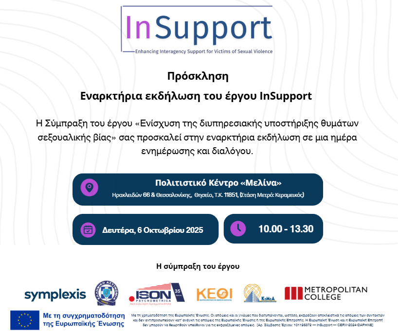 Σας προσκαλούμε στην εναρκτήρια εκδήλωση του InSupport – Ενίσχυση της διυπηρεσιακής υποστήριξης θυμάτων σεξουαλικής βίας που θα πραγματοποιηθεί τη Δευτέρα 6 Οκτωβρίου 2025 (10:00 – 13:30) στο Πολιτιστικό Κέντρο «Μελίνα», Ηρακλειδών 66 & Θεσσαλονίκης, στο Θησείο.