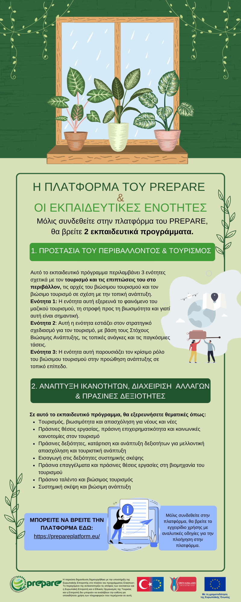 H πλατφόρμα ηλεκτρονικής μάθησης του Ευρωπαϊκού έργου «PREPARE: Προώθηση της προστασίας του περιβάλλοντος και της εκπαίδευσης για την κλιματική αλλαγή» (Promoting Environmental Protection and Learning on Climate Change) είναι τώρα διαθέσιμη online. Το εκπαιδευτικό πρόγραμμα περιλαμβάνει υλικό σχετικά με τον τουρισμό και τις επιπτώσεις του στο περιβάλλον, τις αρχές του βιώσιμου τουρισμού και τον βιώσιμο τουρισμό σε σχέση με την τοπική ανάπτυξη, καθώς και ενότητες σχετικά π ράσινες θέσεις εργασίας, πράσινη επιχειρηματικότητα και κοινωνικές καινοτομίες στον τουρισμό, πράσινες δεξιότητες, κατάρτιση και ανάπτυξη δεξιοτήτων για μελλοντική απασχόληση και τουριστική ανάπτυξη και πολλά ακόμη.