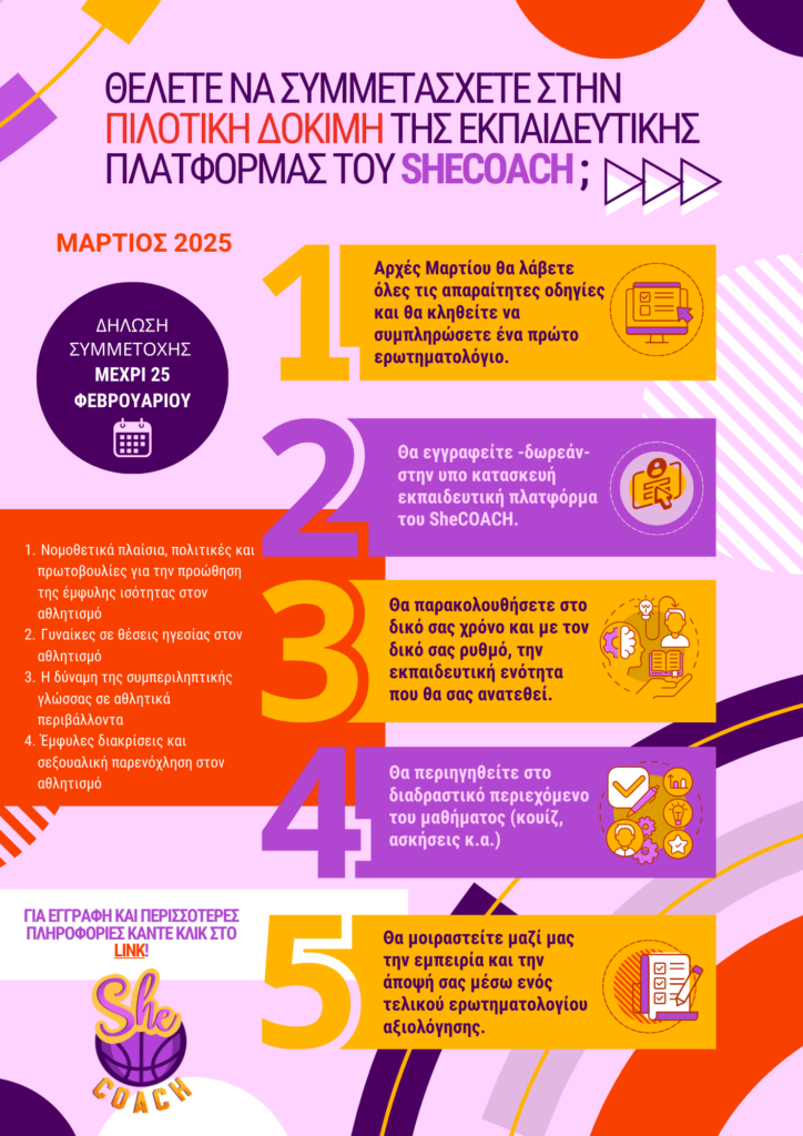 O Σύνδεσμος Ελλήνων Προπονητών Καλαθοσφαίρισης και η Αστική Μη Κερδοσκοπική Εταιρεία Σύμπλεξις σας προσκαλούν να συμμετάσχετε στην πιλοτική δοκιμή της online εκπαιδευτικής πλατφόρμας που δημιουργήθηκε στο πλαίσιο της Ευρωπαϊκής δράσης Erasmus+ Sport SheCOACH: Ισότητα των Φύλων στην Προπονητική.