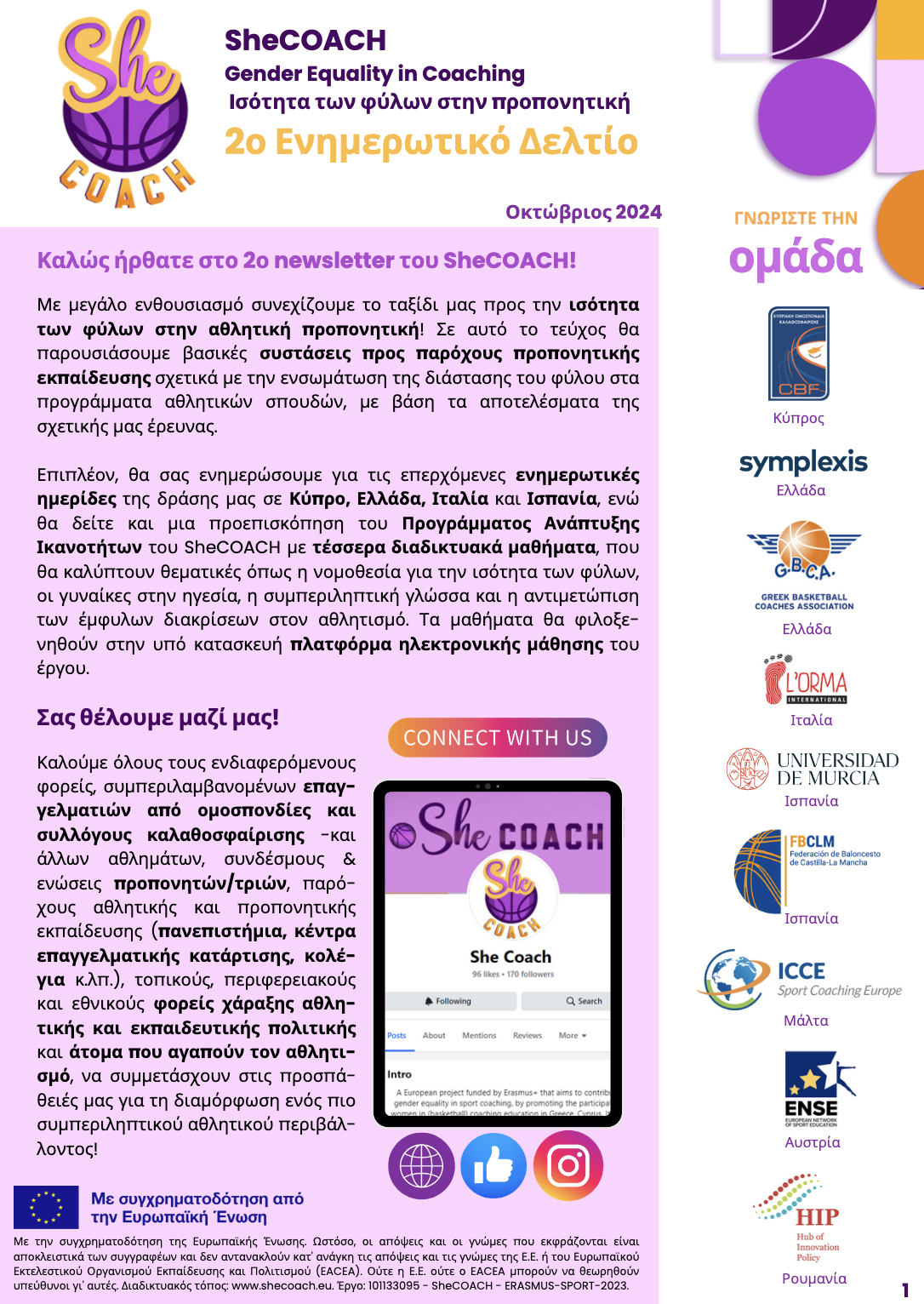 Διαβάστε όλα τα τελευταία νέα του έργου SheCOACH: Gender Equality in Coaching – Ισότητα των Φύλων στην Προπονητική, που σκοπό έχει την προώθηση της ισότητας των φύλων στην προπονητική, επιδιώκοντας την ενίσχυση της συμμετοχής των γυναικών στην προπονητική εκπαίδευση, μέσα από το δεύτερο ενημερωτικό δελτίο που κυκλοφόρησε!