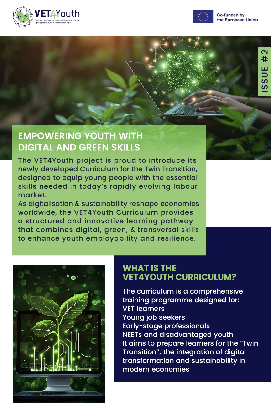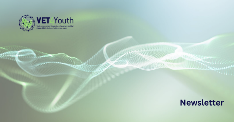 The second newsletter of the VET4Youth project brings together all the latest updates on empowering youth through digital and green skills in the Southern Mediterranean region. In particular, it introduces the newly developed Curriculum designed for VET learners, young people seeking job, early-stage professionals, NEETS and disadvantaged youth aiming to prepare them for the “Twin Transition”; the integration of digital transformation and sustainability in modern economies.